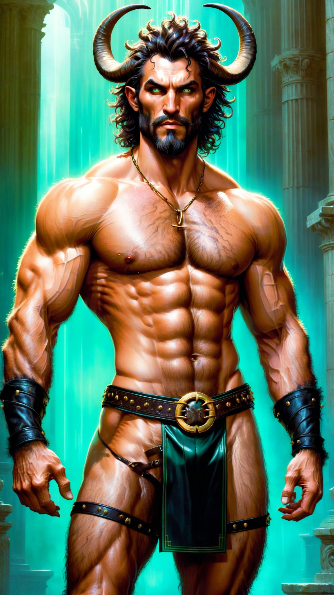 Sexy. Homo-erotic. Manly. Heroic. From the realms of fairies and fantasy in modern times, he is a satyr; man above the waist, goat legs below. Tall, muscular, sinewy, athletic, lithe. Caucasian male of Greek descent, handsome masculine rugged face with strong brow and jaw. Short lengthDark brown curly hair, curly Bob hsirstyle with fluffy curls on top. He has a pair of ram horns on the sides of his temples that curl back. Seductive green eyes with gold flecks. Goatee and well-trimmed mustache on his face. He has a hairy hirsute upper body, thick dark hair on his chest, arms and abs. A black leather o-ring bondage harness on his chest, black leather armbands above his biceps. The hair on his abs and thighs blends into dark, hairy goat legs. He wears a black leather gold-studded belt around his waist that holds on a metallic gold loincloth that barely covers his girthy loins. And he enjoys his loins, very much. Full body pose, with him looking seductively at his audience, as if an invitation to come and enjoy what he has to offer...