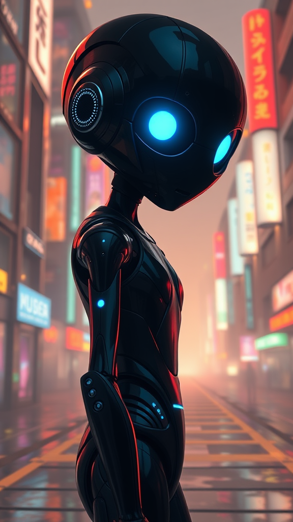 Shadow-hued android with sleek, obsidian-like exterior and luminescent, azure eyes exploring a futuristic, neon-lit urban landscape.