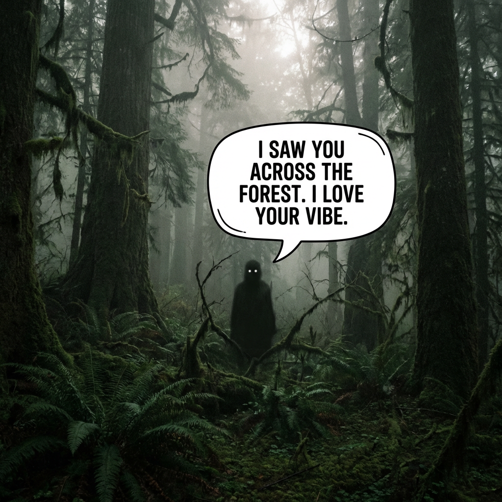 Photorealistic image of a mysterious, foggy forest. The scene features a dark, shadowy, humanoid figure with glowing white eyes standing in the center background. A speech bubble above the figure says "I SAW YOU ACROSS THE FOREST. I LOVE YOUR VIBE." The forest is densely packed with ancient, moss-covered trees and ferns, creating a dark green and earthy color palette. The lighting is dim and diffused, with a soft, ethereal glow filtering through the mist in the upper background, highlighting the heavy fog. The mood is eerie and slightly humorous.