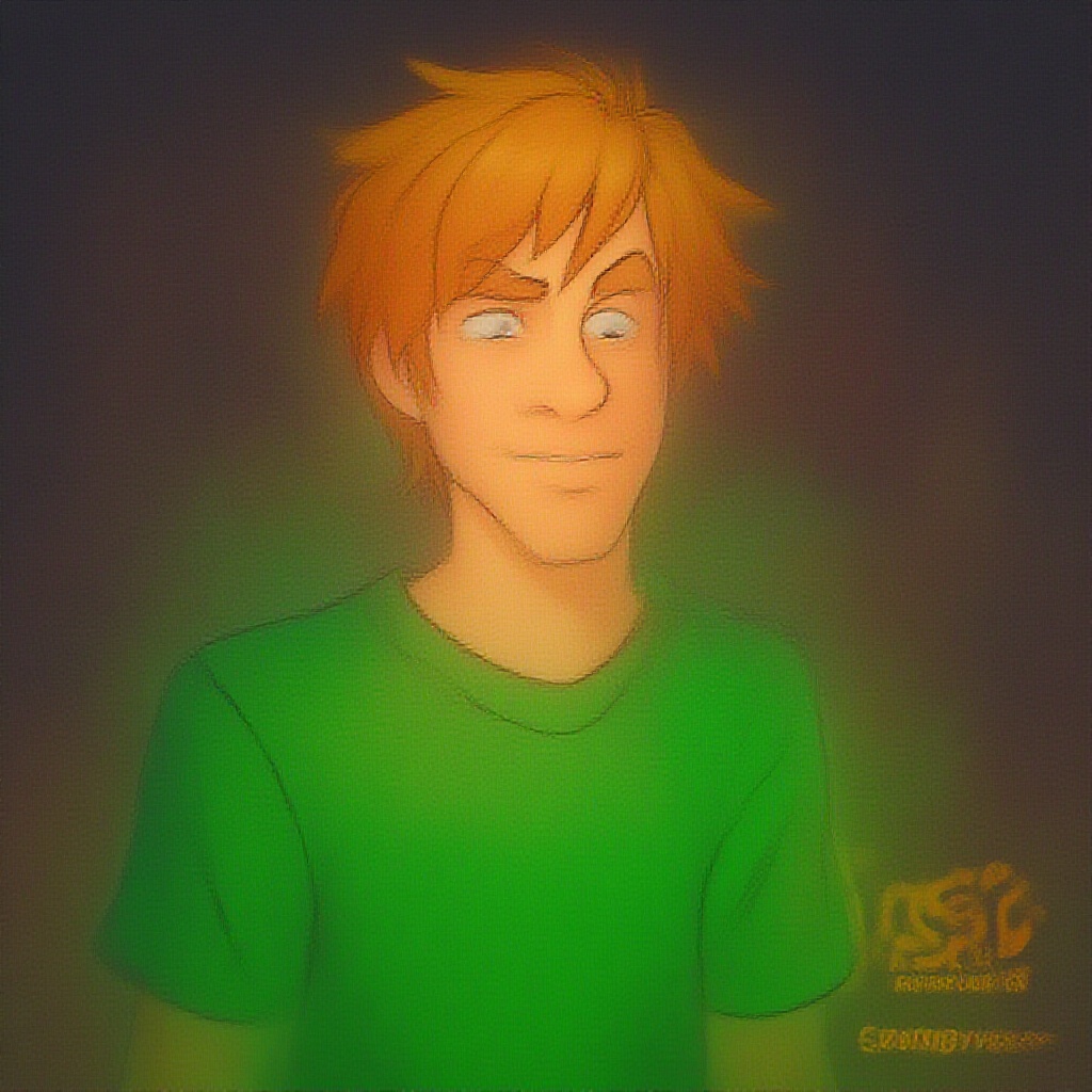 Shaggy from Scooby-Doo, a digital portrait featuring his iconic green t-shirt and light brown hair, depicted with a strong and confident demeanor, showcasing sharp focus and ultra-detailed facial features. The artwork presents a single subject with dynamic lighting, emphasizing his sense of adventure and mystery-solving spirit, while maintaining the essence of concept art and post-processed elements. Scooby-Doo vibes are subtly integrated in the background.