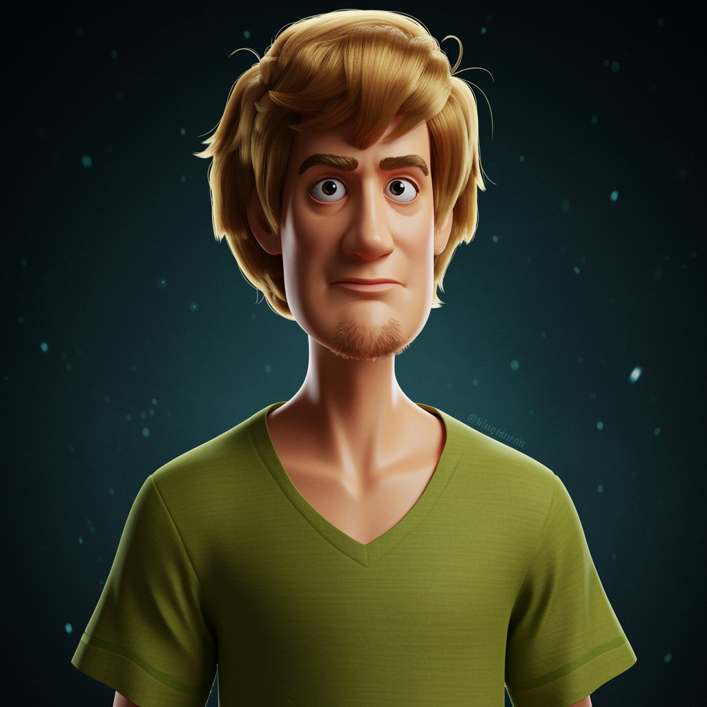 Shaggy from Scooby-Doo, portrayed in a digital art style wearing a green t-shirt, light brown hair styled with a slightly tousled look, appearing unexpectedly strong and confident, sharp focus on his determined expression, enhanced dynamic lighting that casts dramatic shadows, ultra-detailed rendering of his facial features and clothing texture, single subject portrait with subtle hints of mystery in the background, capturing the essence of the classic Scooby-Doo character with a modern twist.