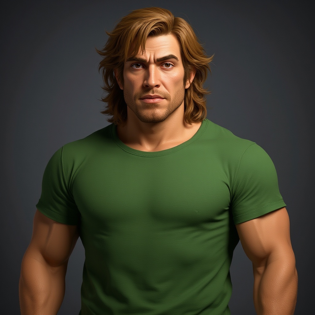 Shaggy Rogers, dressed in his signature green t-shirt, stands as the focused subject in this highly detailed digital art portrait. His light brown hair falls naturally, complementing his surprisingly strong physique, captured with dynamic lighting to enhance his features. The artwork presents Shaggy with a hint of a determined expression, adding a unique twist to his typically laid-back demeanor. The ultra-detailed rendering highlights every subtle nuance, transforming him into a compelling, larger-than-life character, while still reminiscent of the Scooby Doo universe.