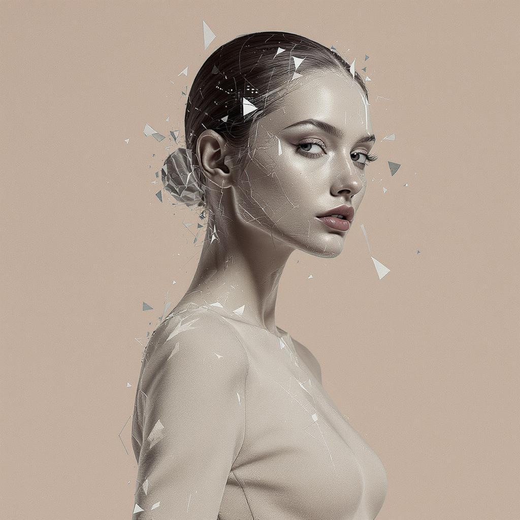 shattered pixels portrait, high fashion allure, luxury brand essence, soft taupe hues, slender silhouette, --ar 4:5