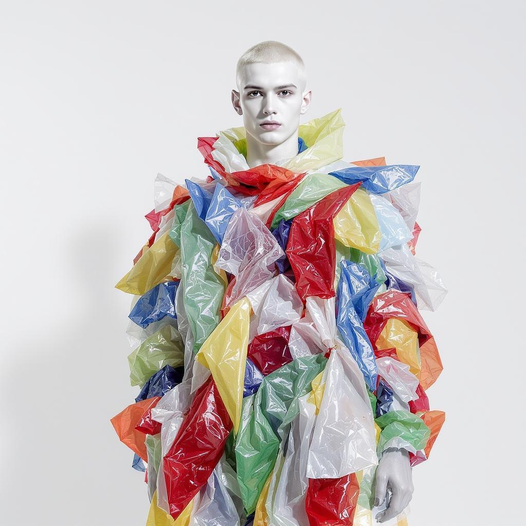 Shattering fashion norms with audacity and inclusivity, an albino male model captivates in a distinctive garment crafted from vibrant plastic bags. A celebration of uniqueness and limitless fashion, underscoring the diverse allure of style.