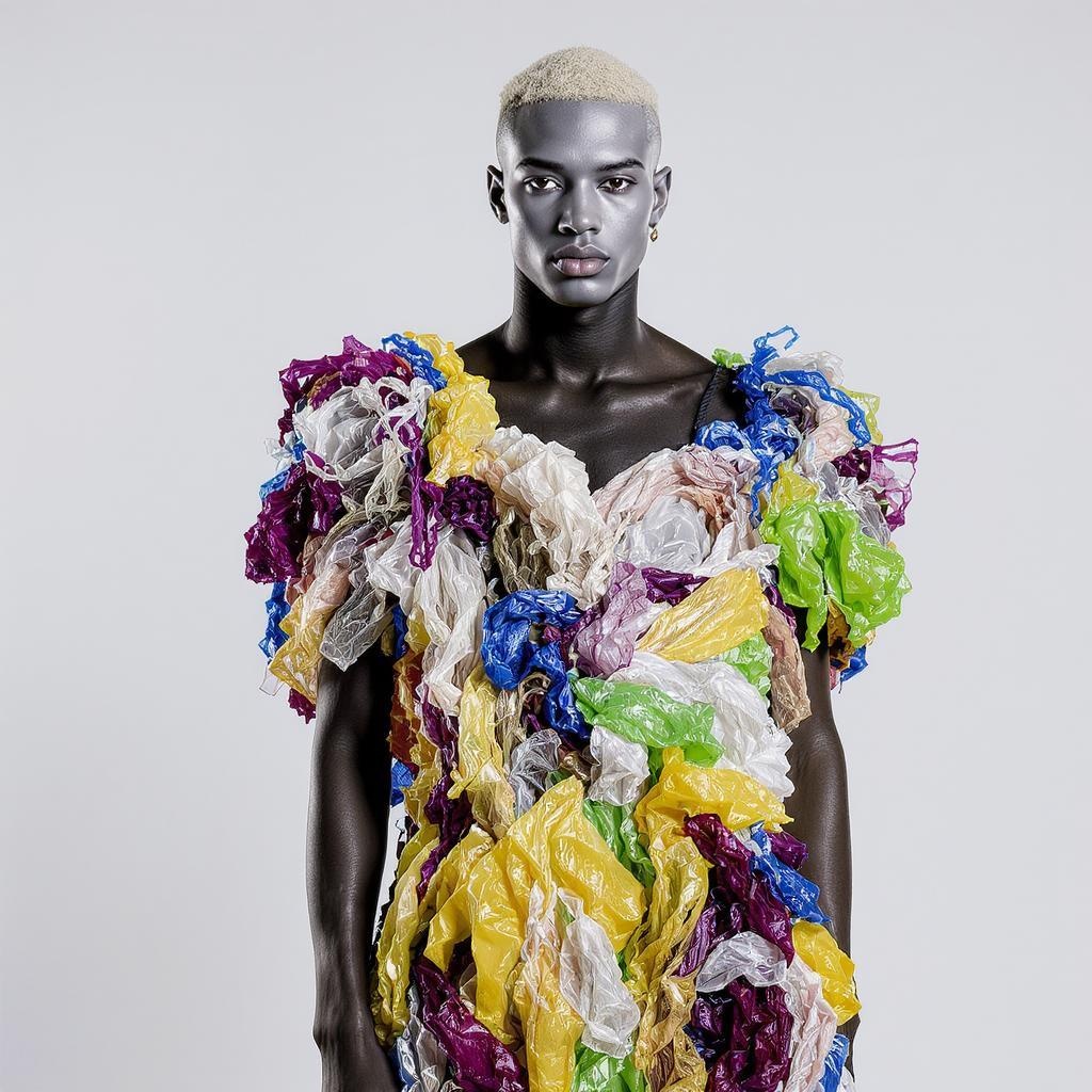 Shattering fashion norms with flair and inclusivity, this captivating albino male model stuns in a striking dress crafted from vibrant, woven plastic bags. A celebration of self-expression and limitless style, this ensemble underscores the diverse allure of fashion.