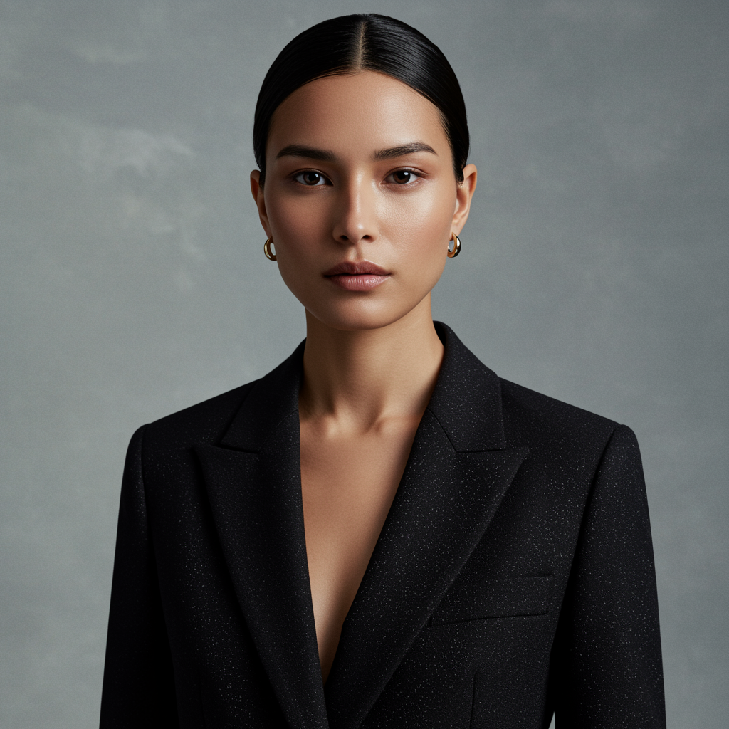She exudes an aura of strength and elegance, her presence commanding and assured. Her tailored black suit fits impeccably, accentuating her silhouette with precision. The luxurious fabric has a subtle shine that plays with the light, enhancing her sophisticated allure.