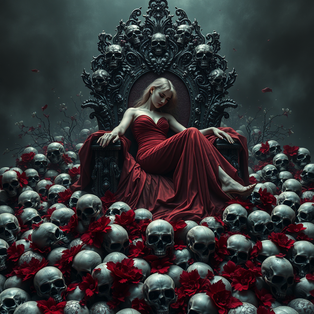 She reclines elegantly on a throne amidst a sea of skulls, her presence both commanding and serene, evoking the artful touch of Magali Villeneuve. The palette of dark silver and deep crimson casts an atmosphere of somber opulence, while hints of Shilin Huang's ethereal intricacy thread through the scene. The mood echoes apocalypse art, where shadows meet vibrant remnants of life, creating a haunting yet beautiful contrast. Her form is accentuated by graceful curves, intertwining with the subtle influence of Dansaekhwa's minimalist textures. This tableau draws inspiration from Adonna Khare's whimsical detail, transforming an otherwise forbidding environment into a complex tapestry of life and decay, as if captured in a moment of serene contemplation amidst chaos.