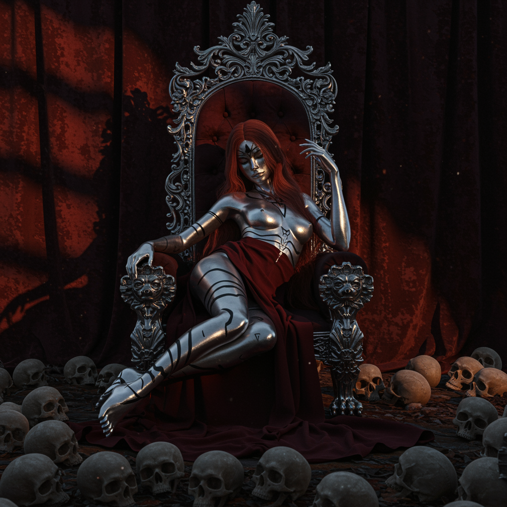 She reclines on an ornate throne surrounded by a field of skulls, the ambience steeped in dark silver and deep crimson hues. The scene is envisioned through the artistic lens of Magali Villeneuve, infused with the delicate intricacies characteristic of Shilin Huang's apocalypse art. Her form exudes fluid curves and grace, reminiscent of Dansaekhwa's minimalist elegance, while the atmosphere is punctuated by the surreal detail of Adonna Khare's imaginative flourishes. Shadows play across the velvet backdrop, weaving a narrative of forgotten realms and timeless enigmas.