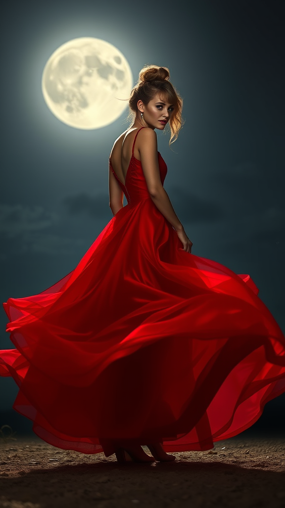 She wore her crimson gown under the night sky, swaying gracefully under the soft glow of the moon, her hair piled high with a touch of glamour, barefoot and vibrant, the dress seemed to shimmer like swirling red mist.