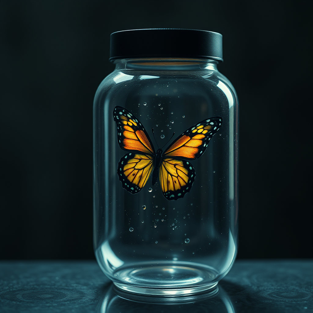 She's like a butterfly trapped in a glass jar with no sky to reach, living in a dystopian world devoid of freedom and dreams.