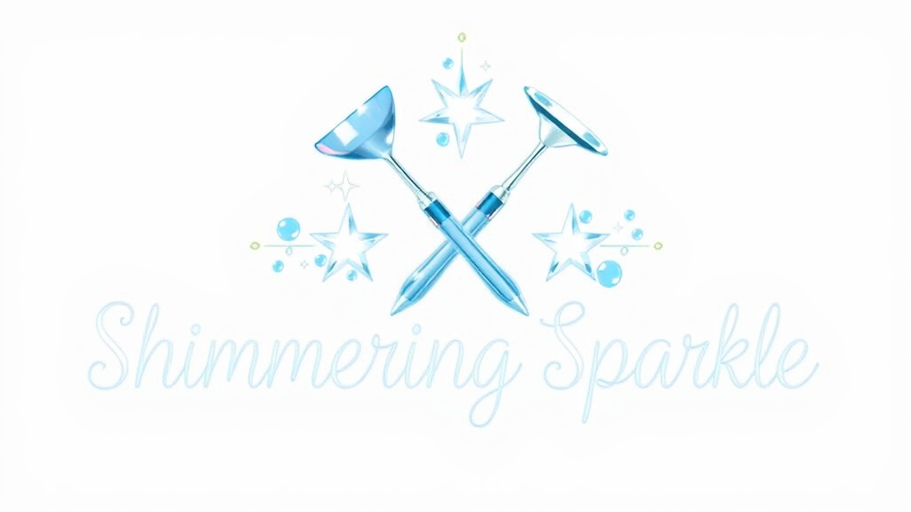 Shimmering Sparkle logo with a polished crystal design featuring a pair of elegant cleaning tools intertwined with stylized stars and bubbles, exuding a fresh and pristine aesthetic.