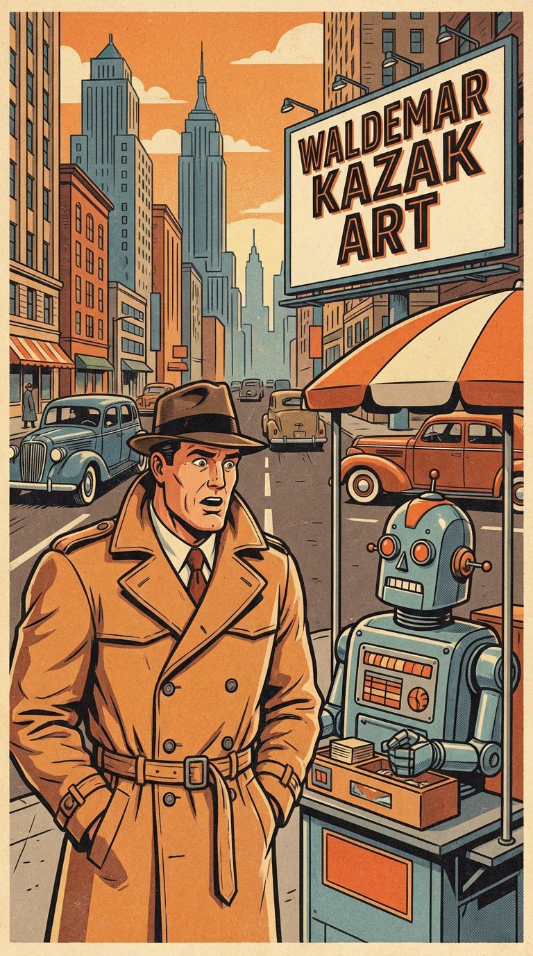 A surprised detective in a trench coat stares at a robot street vendor in a bustling retro-futuristic city. The scene captures a blend of classic comic book aesthetics with an unexpected sci-fi element.