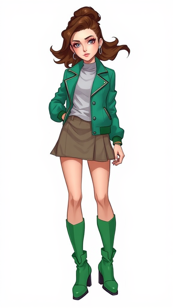 Short skirt, emerald jacket, matching green boots, stylish persona, intricate facial features, perfectly balanced visage, striking eyes, whirlwind energy, 3D sketch, refined and dynamic.