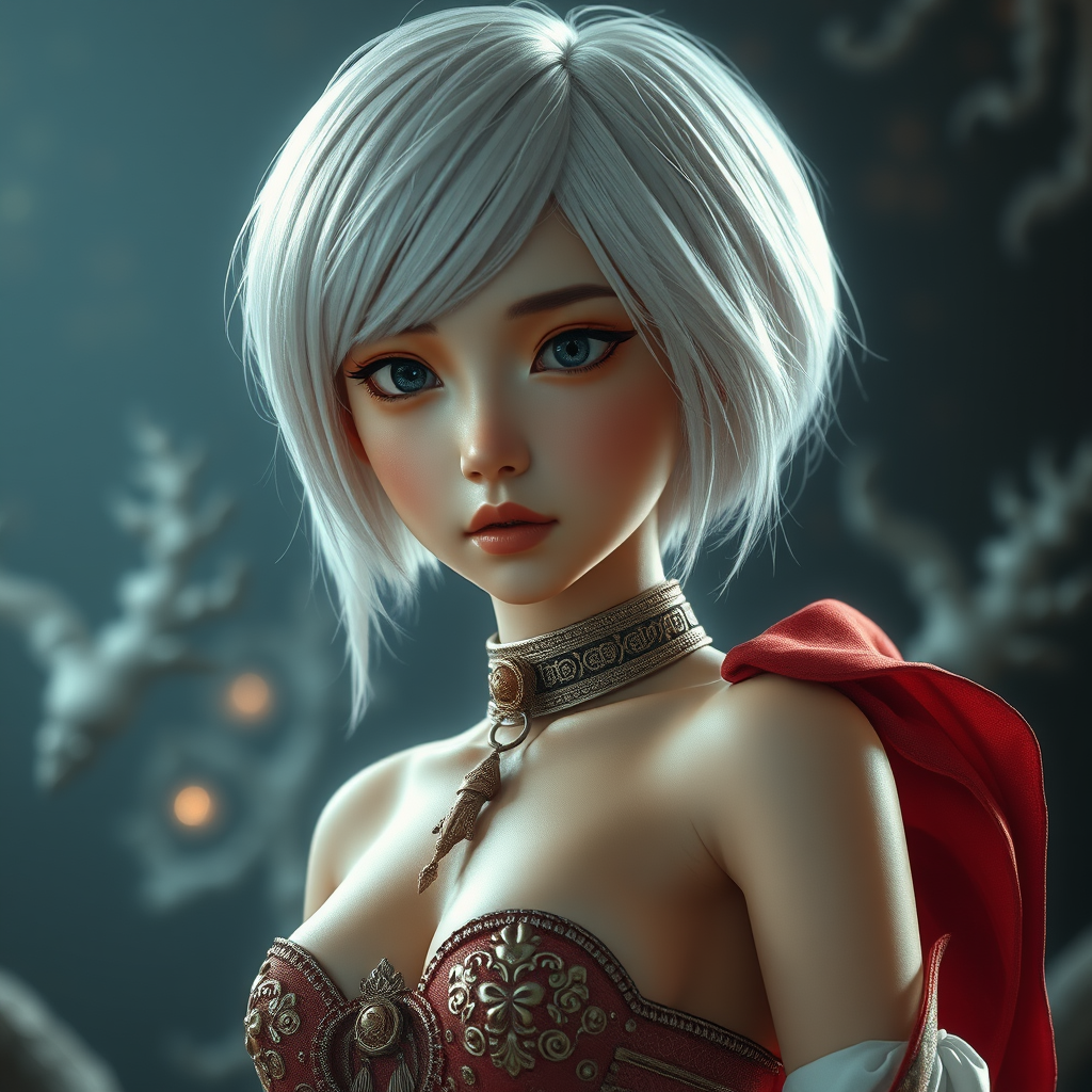 Short white hair, exquisitely detailed face, beautiful young Asian girl, regal queen of the underworld, defined midriff, petite physique, fantasy realm setting, Hyperrealism, cinematic lighting, intricately detailed, awe-inspiring, photography, mesmerizing environment, wide-angle perspective, in the style of Greg Rutkowski and Magali Villeneuve, CGI, 3D, doll-like appearance, octane render, surreal misproportions, abstract forms, dreamlike artifacts, ethereal.