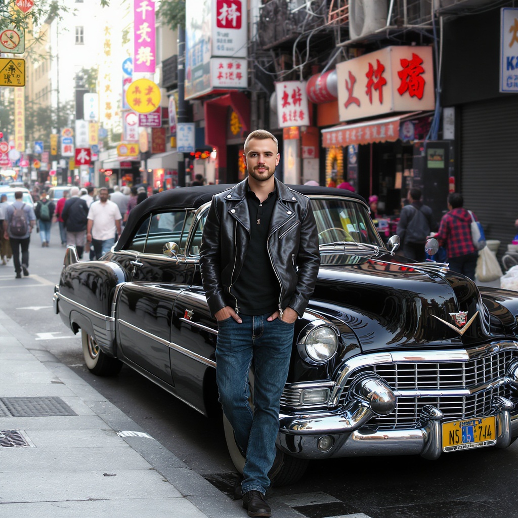 View this AI-generated image featuring a fair skinned shorthair musician exudes confidence beside a classic cadillac on a bustling colorful city street. Created using advanced AI technology, this image showcases vibrant colors. Perfect for creative projects, digital art, inspiration.