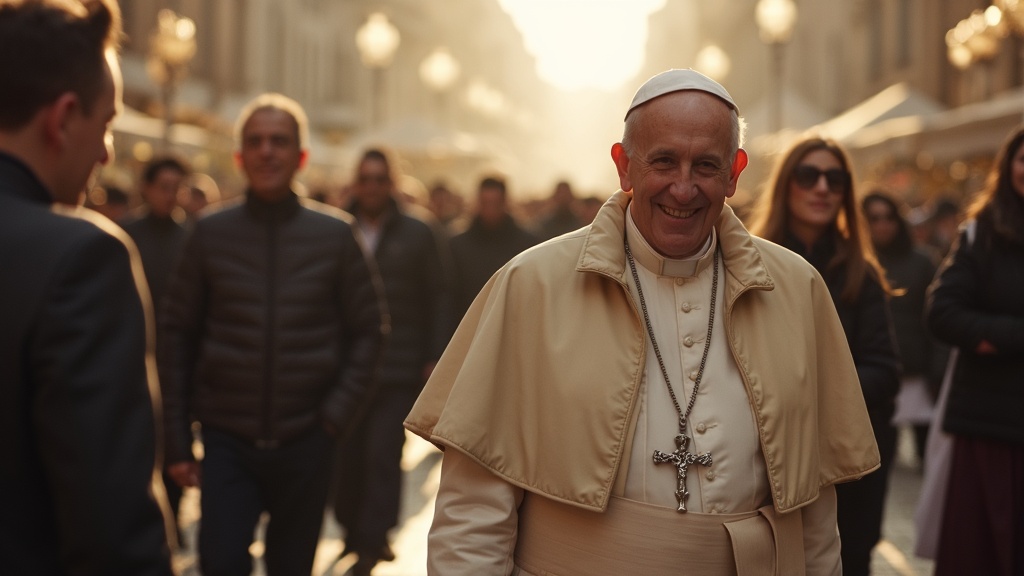 A medium-full shot captures Pope Francis in a stylish puffer jacket, strolling through a bustling street bathed in warm natural afternoon light, reminiscent of a shot taken on Agfa Vista 200 film. The side-angle view gives a dynamic perspective, highlighting the Pope's gentle smile as he pauses to greet passersby. The scene is depicted in 4k resolution with a cinematic quality, and an aspect ratio of 16:9, infusing the image with a touch of stylized elegance and vibrant colors for a modern yet timeless feel.