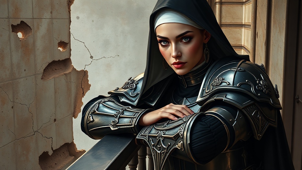 A full shot digital painting of a stunningly beautiful woman, a striking sister of battle leaning on a balcony railing. She has a detailed symmetrical face with reflective eyes, dark eyebrows, and subtle makeup. Her ornate, intricate armor is reminiscent of a nun, crafted in the Warhammer 40k style, set against the backdrop of ruined marble walls with dust particles, bullet holes, and cracks. The scene is illuminated with detailed, dramatic lighting, employing chiaroscuro techniques, evoking a professional, majestic impressionist oil painting akin to the works of Waterhouse, John Constable, and Jeremy Mann. This high-detail piece is trending on ArtStation and CGSociety, drawing on the stylistic influences of Studio Ghibli, Atey Ghailan, and Greg Manchess. Elements like face paint, a veil, headwear, and steel armor add depth, while subtle hints prevent any notion of tiling, low resolution, or odd colors, ensuring a harmonious composition with perfectly proportioned anatomy.