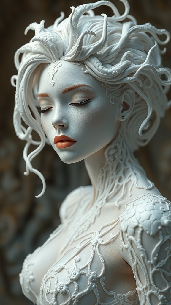 View this AI-generated image featuring a medium shot in full frame capturing an impeccably modeled female form composed of exquisite white bio organic ceramic inspired by the artistic elegance of luis royo alphonse mucha and ross tran the scene features hyper detailed futuristic and corch style elem