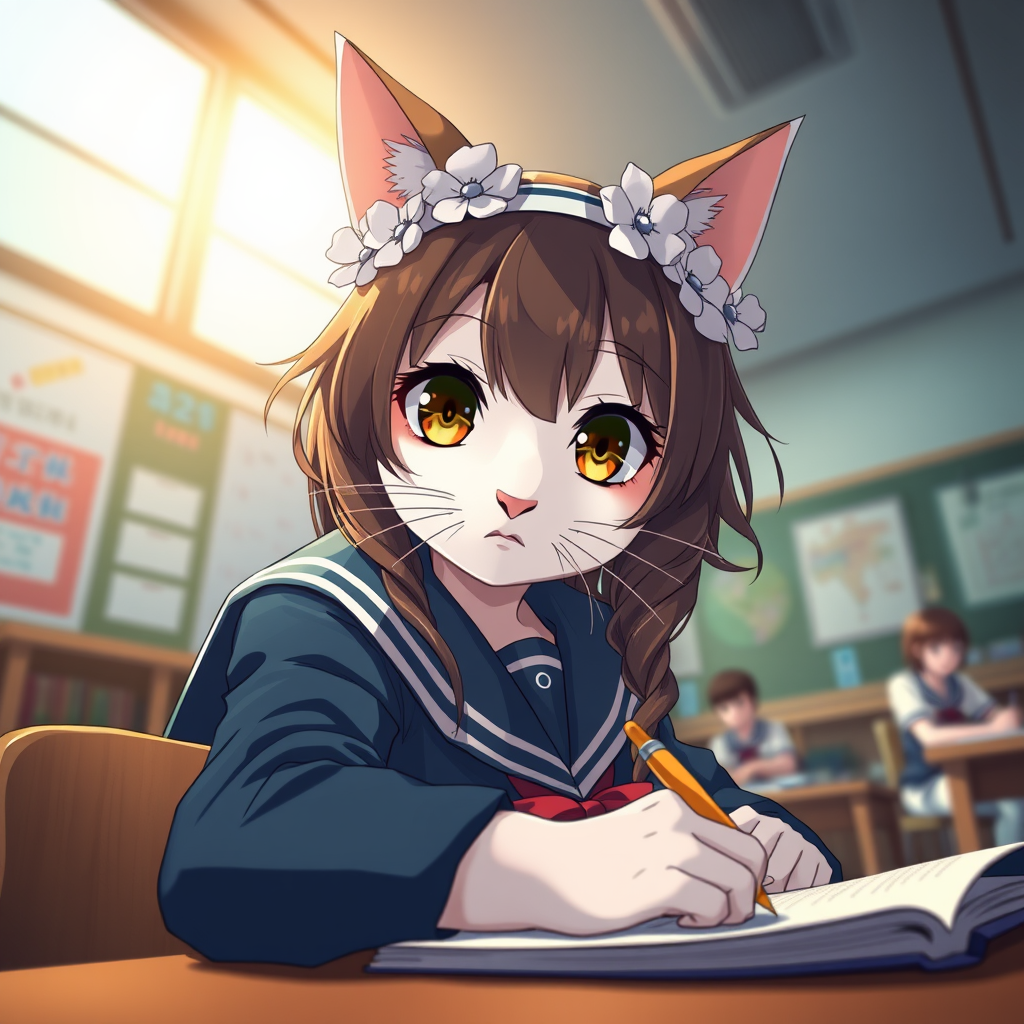Shot from a low angle, an award-winning close-up captures a cat girl in a dynamic pose, centered in the frame, looking toward the camera with captivating eyes. Dressed in a sailor uniform with a flowery headband adorning her long, wavy hair, she is focused on studying in a classroom setting. The scene is illuminated with dynamic lighting that enhances the depth of field, highlighting the ultra-detailed, 2D illustration. This professional work, reminiscent of Makoto Shinkai's style, is trending on Pixiv and is highly Instagrammable.