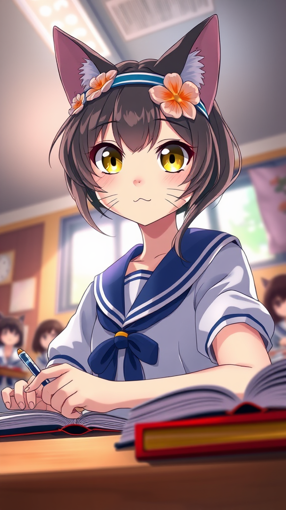 Shot from a low angle, an award-winning close-up, centered and Instagram-worthy, featuring a cat girl looking directly at the camera. She strikes a dynamic pose while studying, dressed in a sailor uniform with a flowery headband adorning her long wavy hair. The setting is a classroom interior with dynamic lighting that emphasizes depth of field. This ultra-detailed 2D illustration draws inspiration from the professional works of Makoto Shinkai, trending on Pixiv.