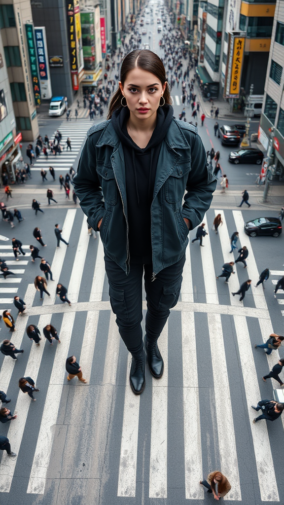 Shot from above, a professional model stands confidently in the middle of a complex and sprawling crosswalk reminiscent of Shibuya's famous scramble. Her gaze is intense as she locks eyes with the camera. Clad in a sleek black washed safari jacket layered over a black hoodie, she pairs her ensemble with matching black cargo pants and dark grey boots. The photograph captures the energy and scale of the urban environment in striking realism and detail, emphasizing her poised stance against the bustling scene below. The image is sharp and polished, with no distracting elements, focusing solely on the interplay of the model, her attire, and the dynamic cityscape, rendered with a cinematic flair.