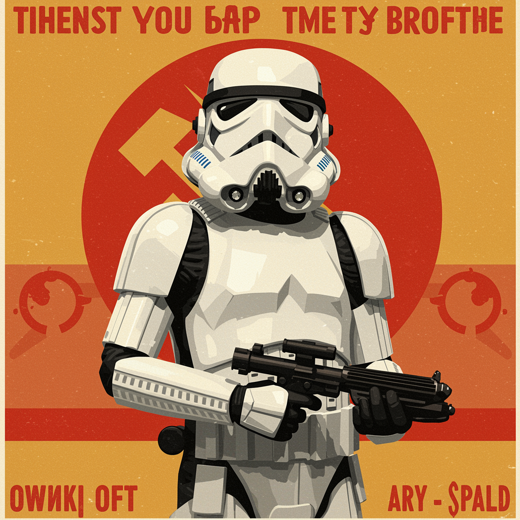 A Stormtrooper showcased in a Soviet-inspired propaganda recruitment poster stands confidently in full armor, surrounded by bold colors and striking design elements. The iconic symbol is cleverly integrated into the composition, exuding a sense of pride. Inspirational slogans encourage unity and strength, while the retro style evokes a sense of iconic nostalgia. The powerful message is reinforced through visually compelling, thought-provoking imagery, creating a captivating and memorable piece.