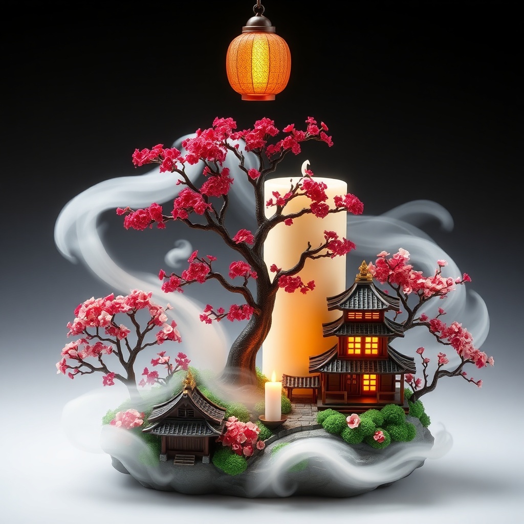 The image showcases a beautifully crafted candle holder designed to resemble a miniature landscape scene. At its heart stands an impressive tree with deep crimson blossoms, appearing to be formed from ethereal white mist swirling around it. The base features several small structures reminiscent of traditional East Asian architecture, complete with gracefully curved roofs and wooden frameworks softly illuminated by a warm glow spilling through their windows. Behind the diorama towers a large ivory candle. Enveloping these central elements are petite trees adorned with delicate pink blossoms, providing a vivid contrast against the lush green vegetation. Near one building rests another glowing candle, seemingly standing in a pool of water, creating gentle reflections that enhance the tranquil ambiance. Above this serene setting hangs a striking amber lantern, casting a gentle ambient light over the entire arrangement. This fusion of natural-inspired artistry and cultural symbolism evokes a sense of peace and beauty reminiscent of idyllic classical Chinese gardens.
