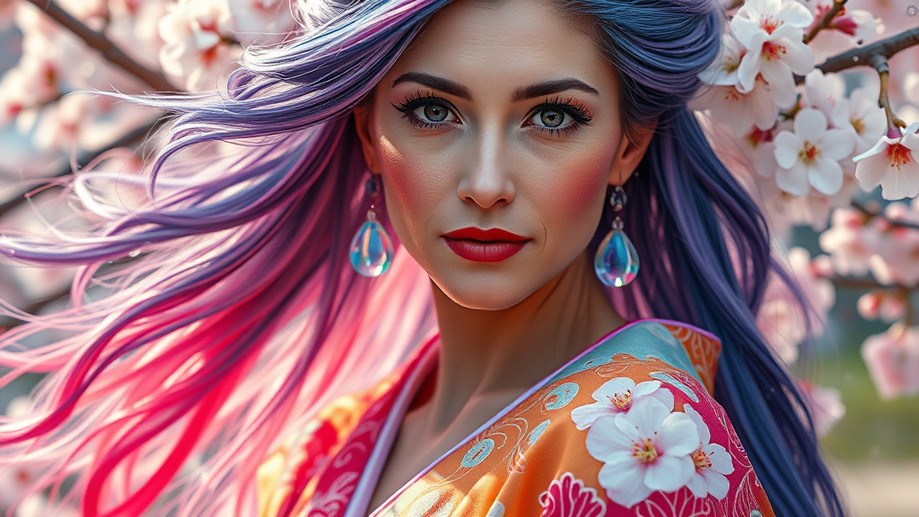 shukezouma, octane render, HDR, 1girl, beautiful mature woman, strikingly detailed eyes, curvaceous and graceful, adorned with opal and paint teardrops, ethereal appearance of being made entirely of paint, dynamic splash effect, flowing long multicolored hair, kimono crafted from paint with incredible detail, opalescent paint-themed kimono, vibrant paint bulbs, water droplets reflecting light, set outdoors amidst blooming sakura trees, vivid color palette, presented in 16k resolution, UHD, HDR10, capturing a scene with remarkable clarity and realism, featuring Model: Lyriel 1.5, avoiding elements like 3d models, cartoonish aspects, anime style, low resolution, skin imperfections, incorrect anatomy, nor young or overly muscular features, ensuring no over-saturation, duplication, disfigurement, mutations, or extraneous elements, keeping the image sharp, focused, and free from visual clutter or compression artifacts.