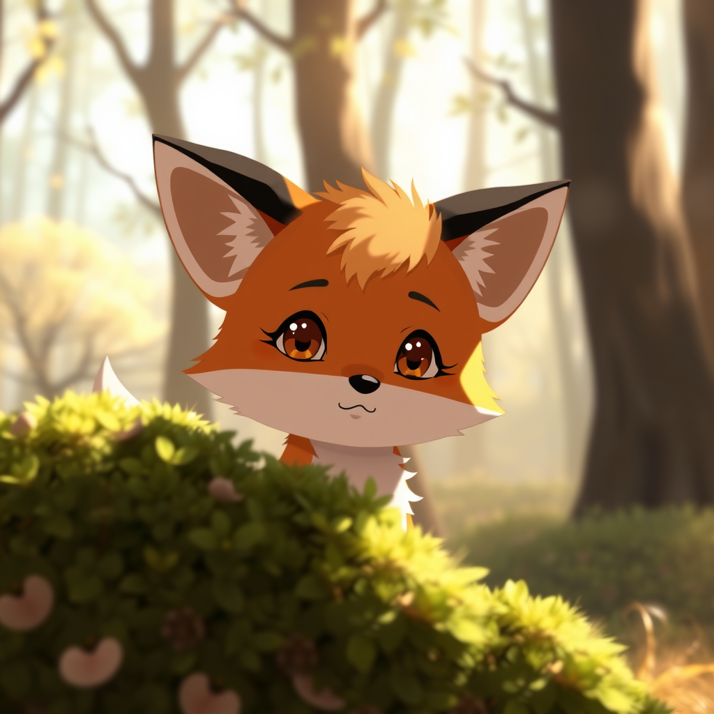 Shy anime fox cub with an orange fluffy tail, showing a cautious demeanor, illustrated in the style of Production I.G. Set against a serene forest background with earthy colors. The scene achieves a harmonious balance using 3ds max and V-ray techniques to create a peaceful ambiance. With a whimsical and gentle expression, the fox cub peeks from behind a bush, surrounded by dappled sunlight filtering through the trees, highlighting its soft fur and gentle eyes, evoking a sense of innocence and wonderment.