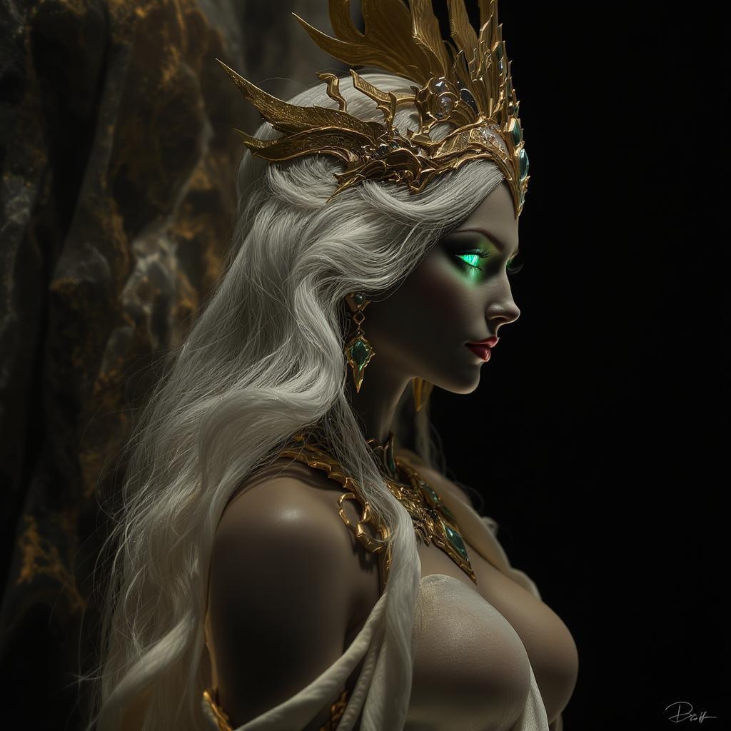 Side profile of a breathtakingly intricate game character representing an eternal goddess, featuring mesmerizing emerald eyes, captured in a dimly lit, photo-realistic style. The image boasts ultra-detail and is reminiscent of photography by Irving Penn and Annie Leibovitz, with expert retouching by Pratik Naik. The scene embodies hyper-realism, with an aura of divine elegance and majesty, set against a luxurious backdrop, elevating the ethereal quality of the goddess.