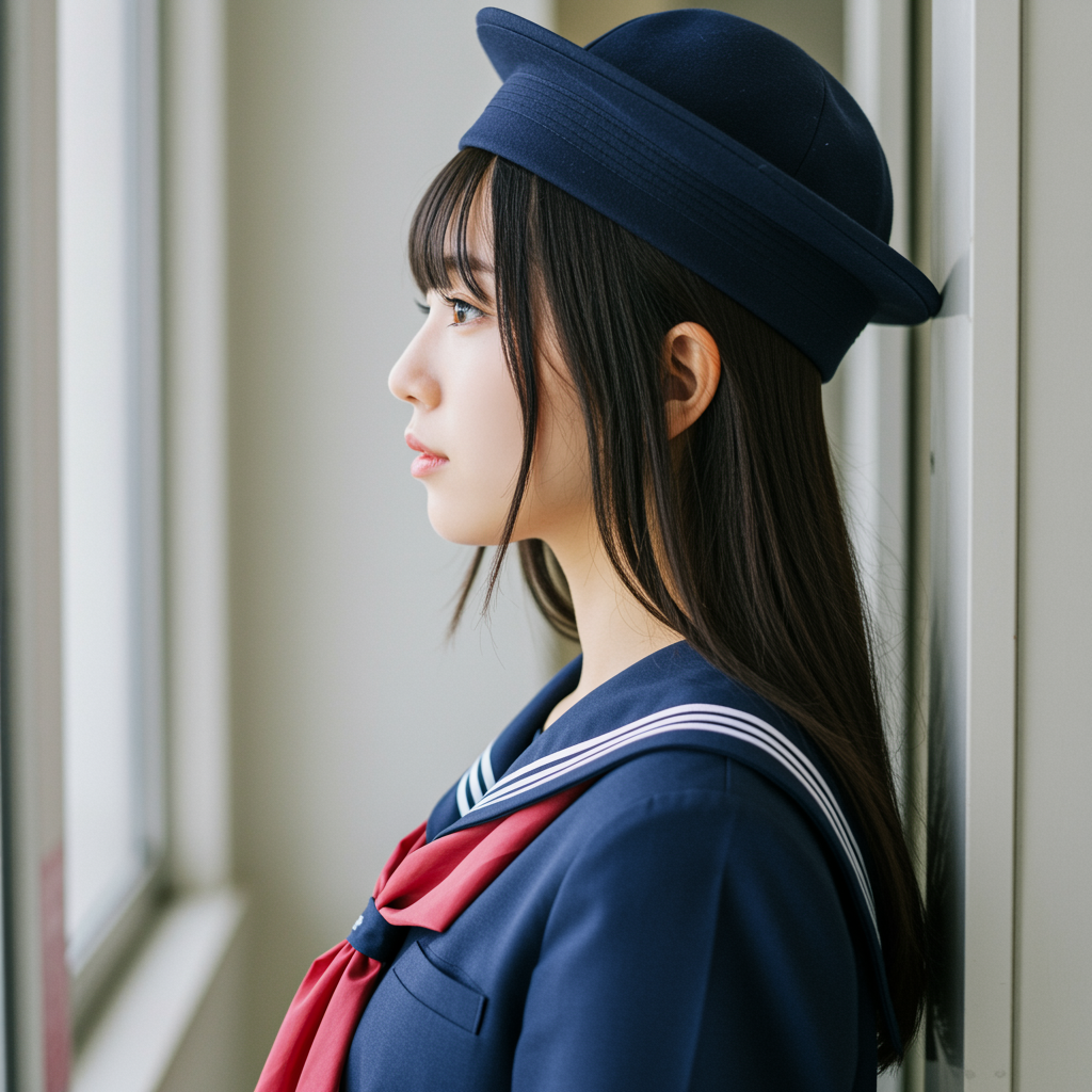 Side profile of a captivating Japanese college student, featuring a school uniform and sailor cap, natural complexion without makeup, showcasing intricate elegance, detailed features, and balanced photometric lighting. The composition offers symmetry and high-quality resolution with a touch of artistic creativity, capturing the essence of beauty and youth in an academic setting.