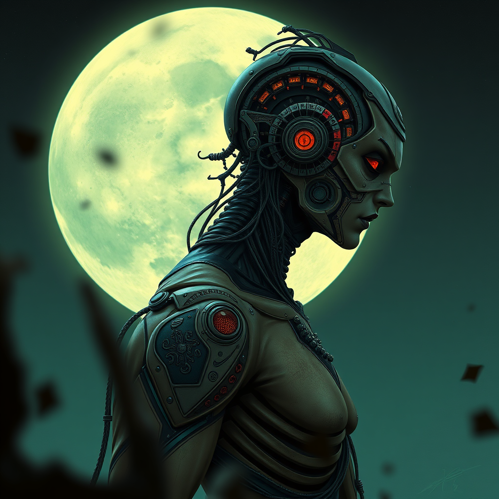 Side profile of a cyberpunk figure with a large moon in the background, rendered in an Art Nouveau style. The image is highly detailed with ornate embellishments, showcasing the vibrant aesthetics of digital concept art. The design is in high definition but intentionally includes digital imperfections like jpeg artifacts, text errors, and signatures. The anatomy hints at creative twists such as extra or missing digits and unusual proportions, immersing the viewer in a surreal, otherworldly scene. Parts of the figure are intentionally out of frame, with blurred or fuzzy areas adding to the enigmatic atmosphere. The overall appearance leans into the mutant and abstract, with distinctively cyberpunk elements intertwined in an artistic portrayal that is both intriguing and unconventional.