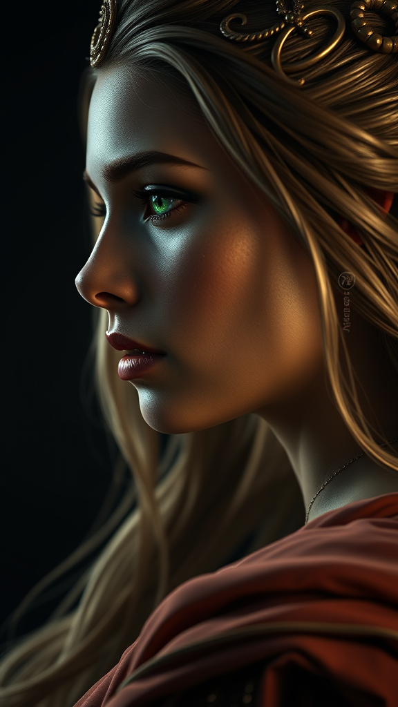 Side profile of an exquisitely detailed game character, eternal goddess with mesmerizing emerald green eyes, rendered in an ultra-realistic and hyper-detailed style. Capture the scene with dim lighting, evoking a sense of mystery and depth. This photorealistic image is reminiscent of the photography styles of Irving Penn and Annie Leibovitz, with expert retouching by Pratik Naik. The goddess's gaze holds timeless wisdom, her intricate features and flowing attire shimmer subtly in the low light, emphasizing her ethereal presence. Her expression reflects both strength and serenity, perfectly balanced in this visually captivating portrait.