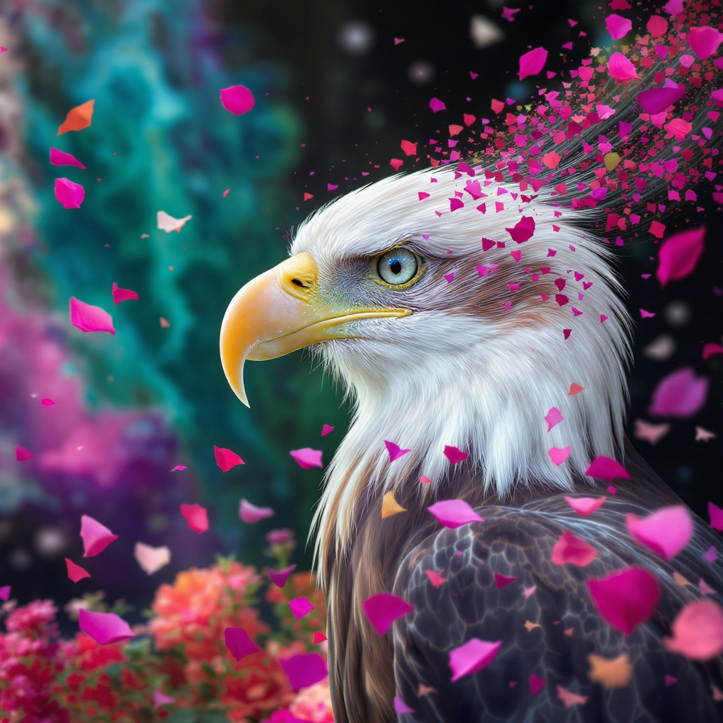 View this AI-generated image featuring a vibrant side view of an eagle with an elongated beak its face prominently in focus against an abstract fantastical background filled with a mesmerizing array of colors the scene is infused with the essence of wind gently stirring vibrant flower petals adding