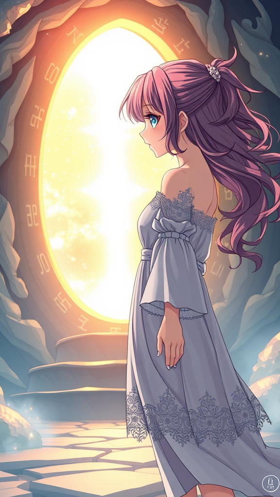 Side view of a female anime character stepping toward a brightly glowing magical portal that bridges fantasy and the real world, depicted in a detailed manga style with photorealistic elements, vibrant colors, and intricate shading. Her hair flows with the energy from the portal, casting a soft illumination on her curious and slightly apprehensive expression. The scene is enriched with an 8k resolution level of detail, capturing the fine lace of her attire and the mystic runes swirling around the portal’s edge, set in a 3:2 aspect ratio.