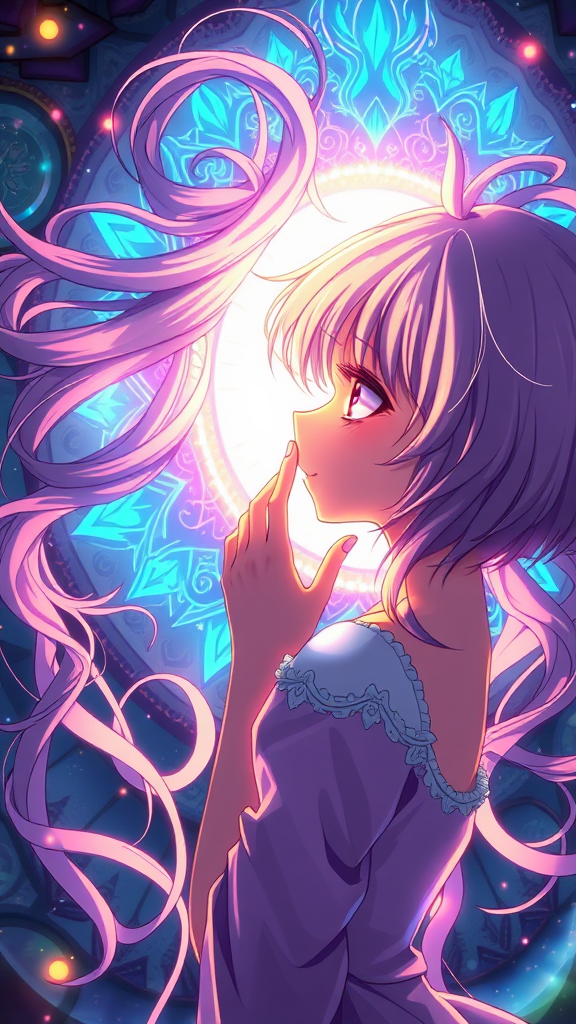 Side view of a female anime-style character delicately approaching a luminescent magical portal that bridges the fictional realm and reality, depicted in a manga style with photorealistic details. Her elaborate, flowing hair seems to be gently pulled toward the portal's glow, enhancing the intricate patterns of light reflecting on her expressive eyes. The portal itself shimmers with vibrant colors, casting dynamic, ethereal shadows around her, as if it's alive with energy. Background elements subtly blend fantasy and reality, framing the scene in an 8k resolution with meticulous attention to detail, maintaining an artistic 3:2 aspect ratio.