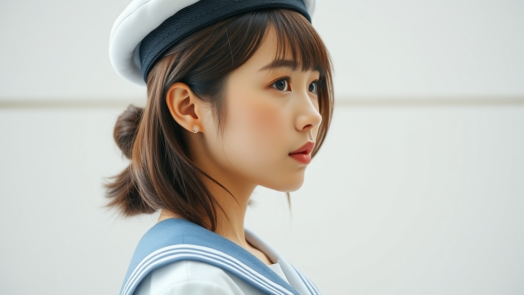 Side view photo of a charming Japanese student, a graceful university attendee, in traditional school attire with a sailor cap, naturally fresh-faced, with intricate elegance and detail, featuring photometric and balanced lighting, capturing symmetry, in high fidelity and resolution.