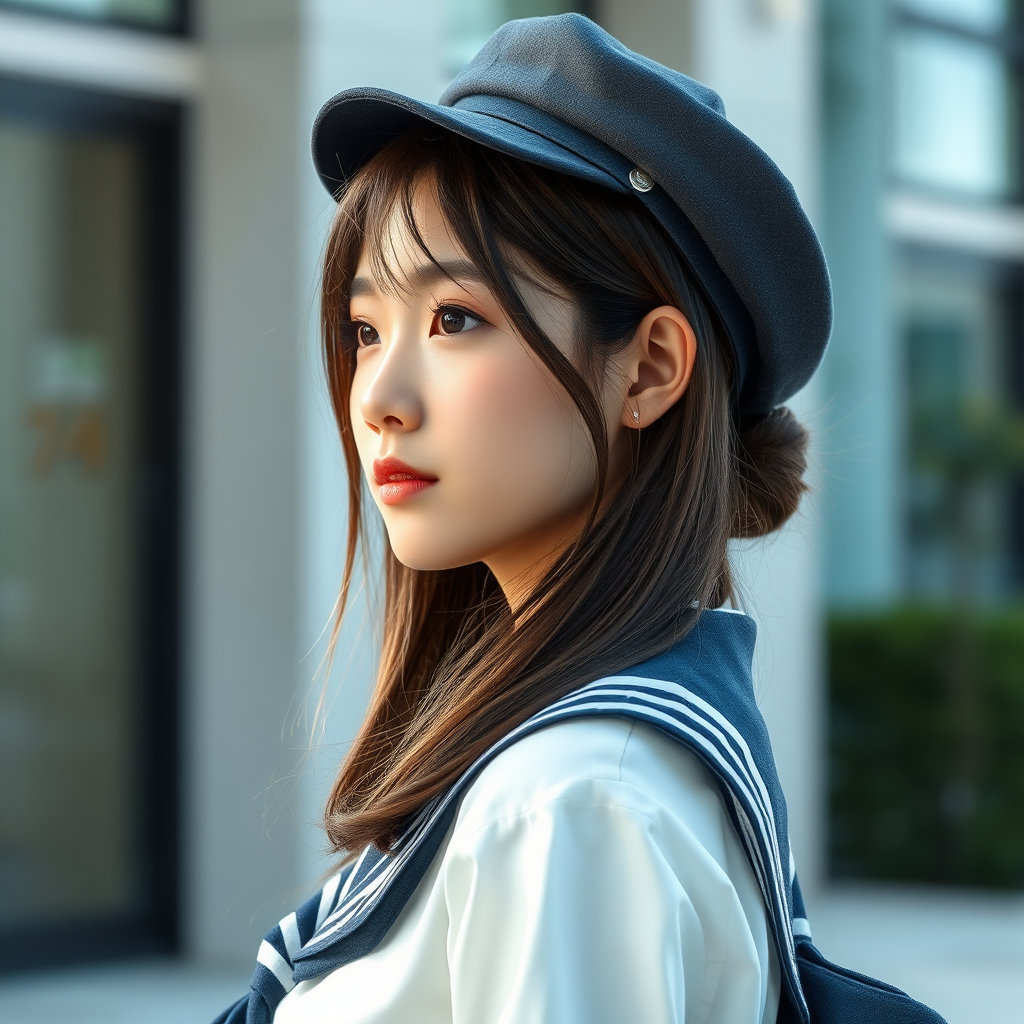 Side view portrait of a pretty Japanese college student, wearing a classic school uniform and a stylish sailor cap, natural beauty without makeup, showcasing intricate and elegant features under beautifully balanced lighting, high resolution imagery capturing detailed and photometric qualities, maintaining artistic depth and clarity throughout.