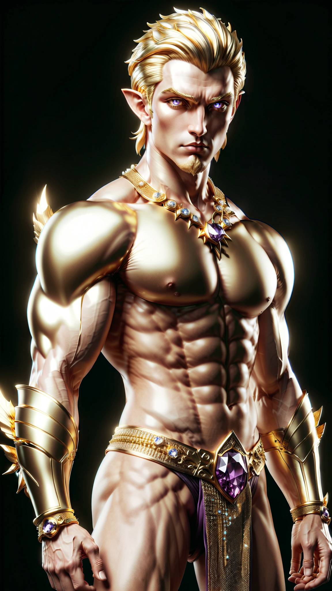 Sidhe Elf in the Dream Realm. He kneels upon a cloud, his bow is drawn and and aimed. The bow is gold, the arrow has a sharp crystal tip, light shining from the arrowhead. His gaze is intense as he aims for his target, his brow furrowed. He is shirtless, his muscles tight and body glistening with sweat and glitter. The hair under his arms thick and visible. He wears reflective metallic gold paulfrons upon his muscled shoulders. A gold chain with an amethyst crystal pendant around his neck. His golden blond hair is shaved short in the back and sides {{{short hair}}}, longer on top and spiky, which makes his elven ears more obvious, a golden metallic headband with an amethyst jewel at the center around his head. His eyes are like opals, bright and intense, changing with his moods. His face is handsome, masculine, hairless, aside from his thick manly brows. Strong brow and jaw, cleft chin. He wears metallic gold bracers on his strong arms, and metallic gold boots. His legs are bare, roped with muscle. His groin barely covered by a metallic gold loincloth, the middle part draped over his massive genitals. Wide shouldered, narrow waist, sinewy, well defined, light blonde hair on chest, narrow trail of hair on abs. Full body pose, the stars shining down upon him... (((Short hair!)))