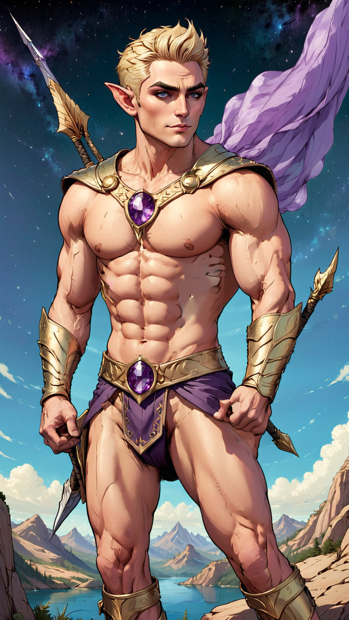 Sidhe Elf in the Dream Realm. He kneels upon a cloud, his bow is drawn and and aimed. The bow is gold, the arrow has a sharp crystal tip, light shining from the arrowhead. His gaze is intense as he aims for his target, his brow furrowed. He is shirtless, his muscles tight and body glistening with sweat and glitter. The hair under his arms thick and visible. He wears reflective metallic gold paulfrons upon his muscled shoulders. A gold chain with an amethyst crystal pendant around his neck. His golden blond hair is shaved short in the back and sides {{{short hair}}}, longer on top and spiky, which makes his elven ears more obvious, a golden metallic headband with an amethyst jewel at the center around his head. His eyes are like opals, bright and intense, changing with his moods. His face is handsome, masculine, hairless, aside from his thick manly brows. Strong brow and jaw, cleft chin. He wears metallic gold bracers on his strong arms, and metallic gold boots. His legs are bare, roped with muscle. His groin barely covered by a metallic gold loincloth, the middle part draped over his massive genitals. Wide shouldered, narrow waist, sinewy, well defined, light blonde hair on chest, narrow trail of hair on abs. Full body pose, the stars shining down upon him... (((Short hair!)))