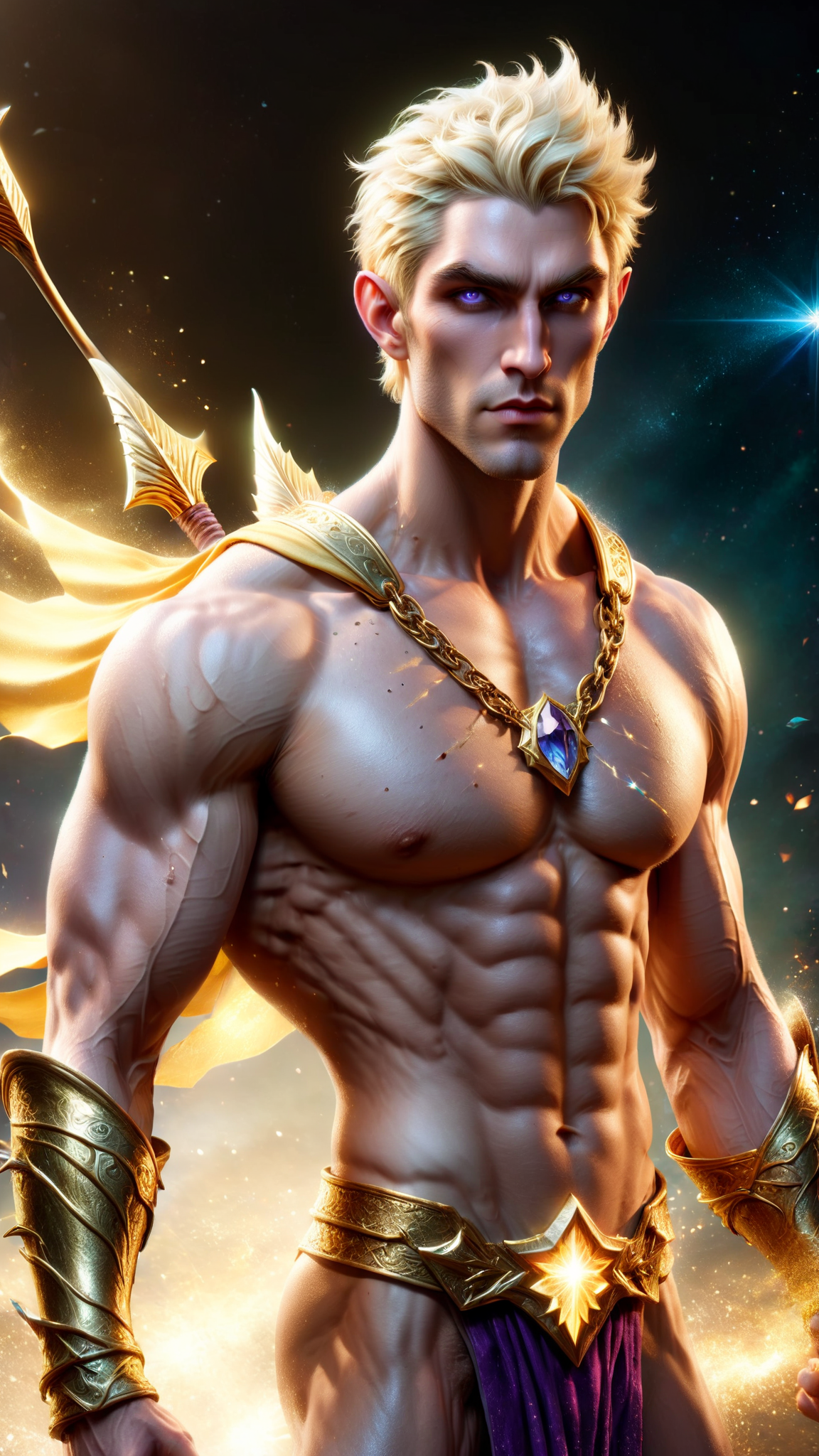 Sidhe Elf in the Dream Realm. He kneels upon a cloud, his bow is drawn and and aimed. The bow is gold, the arrow has a sharp crystal tip, light shining from the arrowhead. His gaze is intense as he aims for his target, his brow furrowed. He is shirtless, his muscles tight and body glistening with sweat and glitter. The hair under his arms thick and visible. He wears reflective metallic gold paulfrons upon his muscled shoulders. A gold chain with an amethyst crystal pendant around his neck. His golden blond hair is shaved short in the back and sides {{{short hair}}}, longer on top and spiky, which makes his elven ears more obvious, a golden metallic headband with an amethyst jewel at the center around his head. His eyes are like opals, bright and intense, changing with his moods. His face is handsome, masculine, hairless, aside from his thick manly brows. Strong brow and jaw, cleft chin. He wears metallic gold bracers on his strong arms, and metallic gold boots. His legs are bare, roped with muscle. His groin barely covered by a metallic gold loincloth, the middle part draped over his massive genitals. Wide shouldered, narrow waist, sinewy, well defined, light blonde hair on chest, narrow trail of hair on abs. Full body pose, the stars shining down upon him... (((Short hair!)))