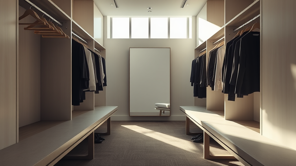 Silent wardrobe with rows of vacant hangers, shoes neatly lined up beneath a long mirror, soft light filtering through tall windows onto untouched benches, creating an atmosphere of calm and anticipation.