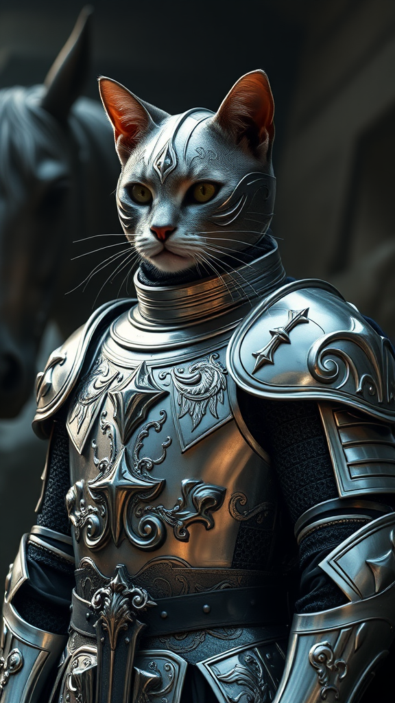 Silver-clad cat knight, majestic and poised in intricately detailed armor, stands valiantly against a cinematic backdrop. The portrait captures the essence of dangerhorse, a mythical steed, in the background. The armor glimmers with fine silver details, offset by luxurious hints of silk. The scene is bathed in dramatic 4k cinematic lighting, highlighting the craftsmanship and valor of the knight, while maintaining an atmosphere free from imperfection or blemish.
