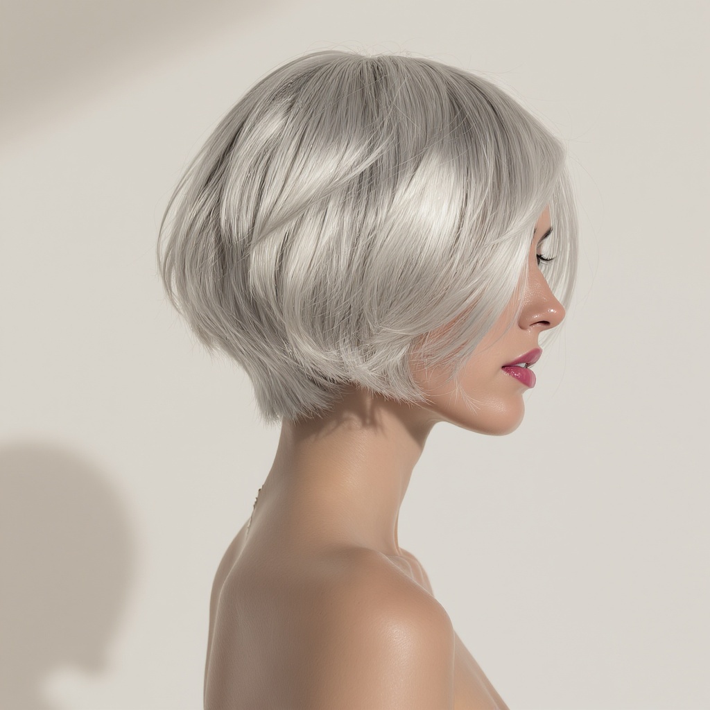 Silver-toned bob haircut woman against an ivory hue background in a studio setting, featuring natural hair texture with soft highlights and intricate realistic details, presented in a high-fashion editorial style with a touch of artistic flair, aspect ratio 9:16, focusing on capturing the elegance and simplicity of the hairstyle under refined lighting conditions.