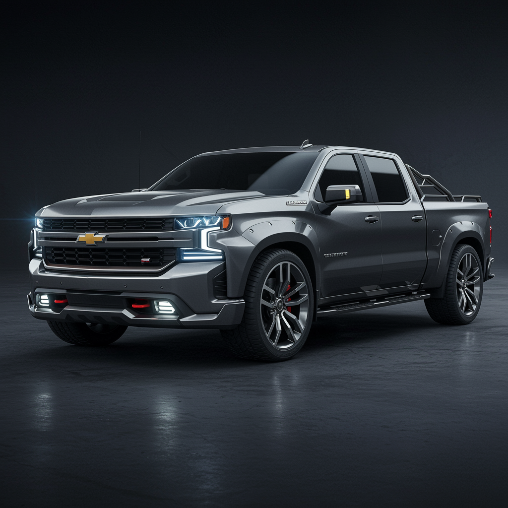 Silverado futuristic pickup truck, a sleek, reimagined design blending steampunk aesthetics with Cyberpunk 2077 inspirations. Featuring an altered, aerodynamic front end, metallic accents, and advanced technology elements, this concept merges classic robustness with a forward-thinking, innovative style.