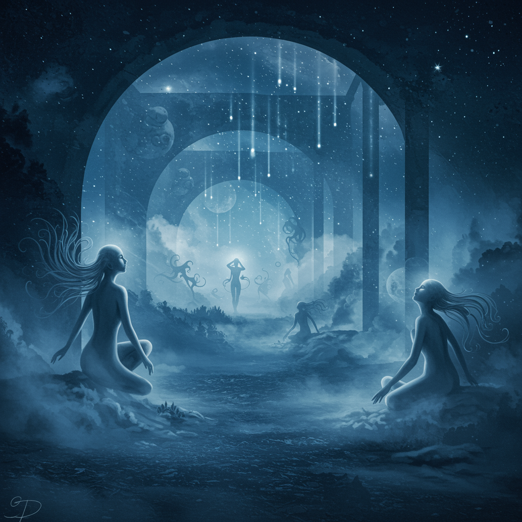 Silvery whispers of meditation's depths reveal themselves through dreamlike landscapes, where surreal figures float amidst swirling indigo and celestial hues. Mist dances around otherworldly forms in unconventional poses, while stardust glimmers cascade gently through the ether. Celestial realms intertwine with enigmatic passageways, merging earthly and cosmic spheres. Ethereal beings, elegantly elongated, explore the secret paths of the mind, tracing forgotten constellations in the velvet night. Imagination swirls like smoke, weaving through the fabric of a mystical universe where meditation is both journey and destination.