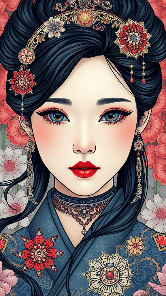 Single girl, Korean beauty, stunning CG illustration with intricate and ultra-detailed design, celebrating Korean tradition in an artistic and cinematic style. Featuring a solo girl with a beautifully detailed face adorned with glittering accessories, the composition blends line art with an abstract, art nouveau background. The dynamic layout is presented in 8k UHD HDR for visually striking effects. Careful attention to clarity and focus avoids issues like duplication, mutation, or extra features. Ensures high resolution and seamless presentation without any artifacts or distractions.