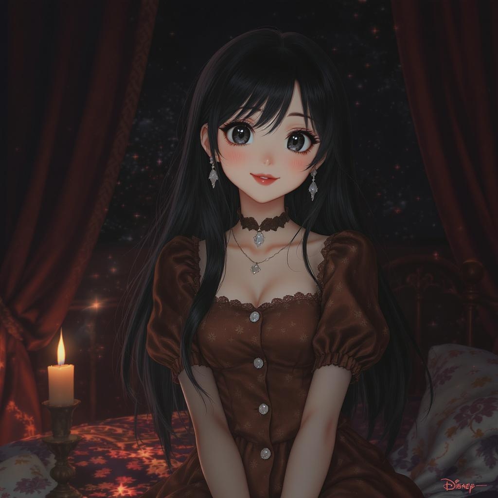 Single girl, solo, long black hair, deep black eyes, warm smile, earrings, cozy pajamas, short-sleeved top, delicate jewelry, puffy sleeves, gazing at the viewer, charming brown dress with puffy short sleeves, depicted from the waist up, highly detailed background, 1950s-inspired dark setting, gentle blush on cheeks, soft lips, fantastical essence of Disney and Pixar, 8k clarity, UHD and HDR quality, anime and manga style, digital art with glowing effects, expertly hand-drawn, rendered using octane render and techniques from cinema 4D and Blender, dark and atmospheric, ultra-high detail in 4k, cinematic allure, sharp focus, hyperrealism with substantial depth, masterpiece quality, vivid and rich color palette, conceptual art trending on ArtStation, edifice by Ed Blinkey, Atey Ghailan, Studio Ghibli influences, stylistic elements from Jeremy Mann, Greg Manchess, Antonio Moro, intricate and dramatic photorealistic painting, inspired by midjourney, greg rutkowski's finesse, art trending on CGSociety, with slight artistic modifications ensuring elegance and beauty, avoiding extraneous details, maintaining clarity and focus on the subject matter.