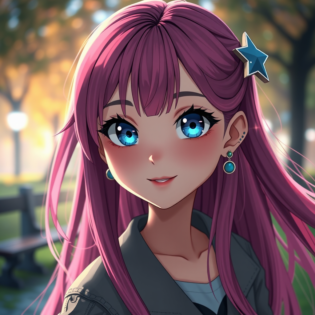 Single girl, striking eyes, long silky locks, blue eyes, stylish earrings, elegant jewelry, solo, chic skirt, gazing at viewer, vibrant pink hair, warm smile, flowing hair, star-shaped hair accessory, trendy jacket, delicate lips, enchanting park setting, 3D cartoon essence, 8k resolution, UHD, HDR visuals, anime-inspired photography, manga flair, digital illustration, luminous effects, hand-drawn charm, octane render magic, cinema 4d finesse, atmospheric and captivating, ultra-detailed, cinematic allure, clear focus, hyperrealism, dynamic depth of field, artistic masterpiece, vivid color palette, 3d octane render, conceptual beauty, trending on ArtStation, hyperrealistic vibrancy, modelshoot aesthetic, oil painting majesty by Ed Blinkey, Atey Ghailan, Studio Ghibli influences, inspired by Jeremy Mann, Greg Manchess, Antonio Moro; intricate and high detail, clear focus, dramatic flair, photo-realistic artistry by Midjourney and Greg Rutkowski.