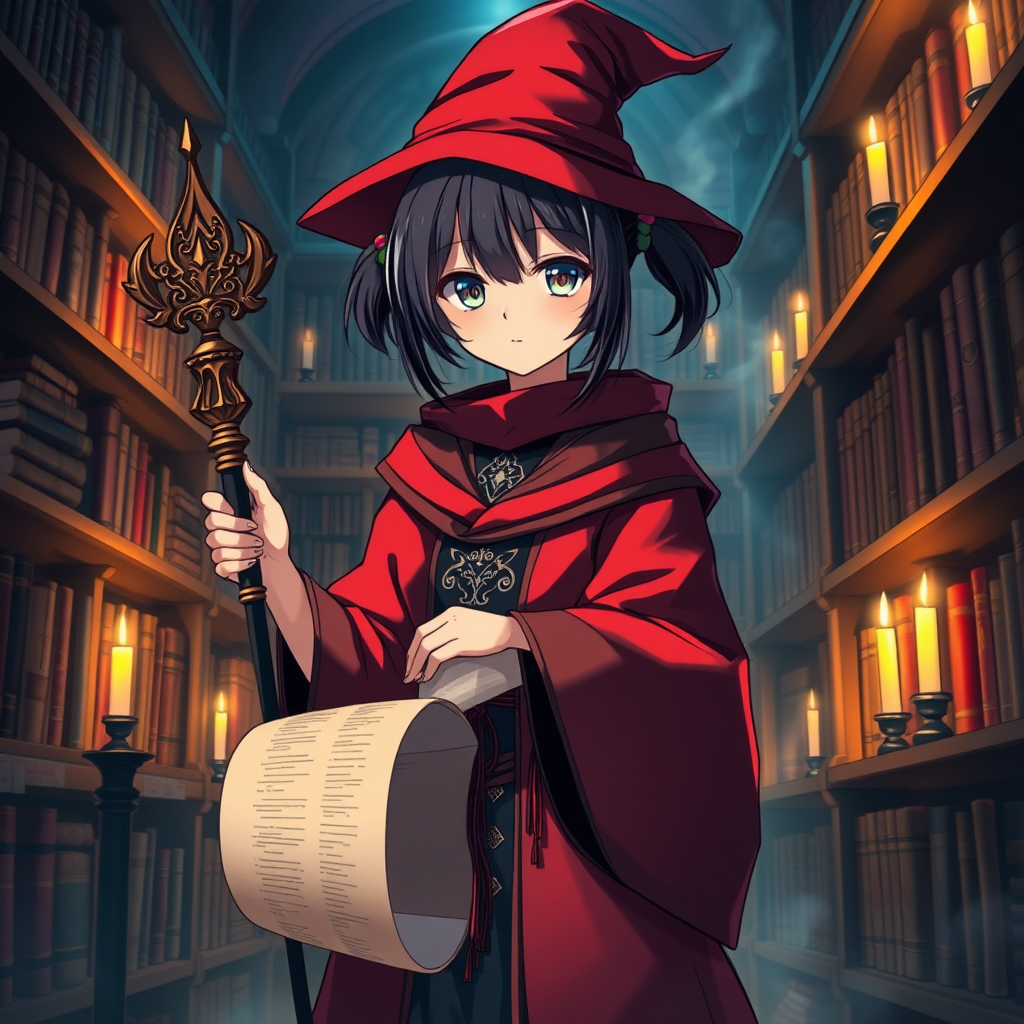 Single girl with very short black hair styled in twintails, wearing a red and black robe inspired by Arabic design. She holds a magic staff and a scroll, standing in a mystical library illuminated by candlelight. A witch hat rests on her head, adding a whimsical touch. The scene captures an enchanting atmosphere with high resolution, vibrant colors, and intricate details. She gazes directly at the viewer, surrounded by shelves filled with ancient tomes and mystical artifacts. Her expression conveys a sense of wonder and curiosity, emphasizing the fantasy theme.
